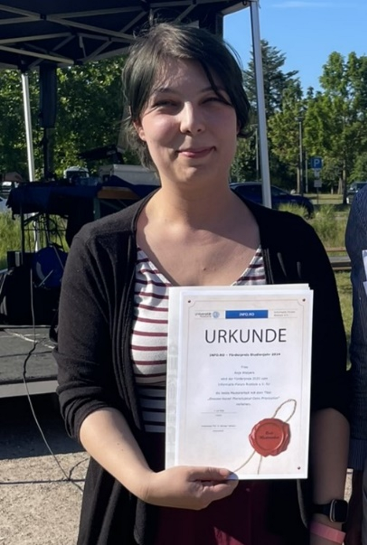M.Sc. Anja Wolpers, Absolventin des Masterstudiengangs Informatik, wurde für ihre herausragende Abschlussarbeit „Disease-based Phenotypical Gene Priorization“ mit dem INFO.RO Förderpreis für die Beste Masterarbeit im Jahr 2024 ausgezeichnet. Die feierliche Preisverleihung wurde vom Verein Informatik-Forum Rostock e.V. (INFO.RO) auf dem diesjährigen Sommerfest der Informatik und Mathematik vorgenommen. Die Arbeit wurde unter der Betreuung von Prof. Dr. rer. nat. habil. Adelinde Uhrmacher am Institut für Visual and Analytic Computing realisiert. Der Preis ist mit 400 Euro dotiert.